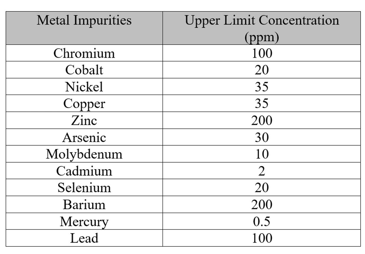 The limits of concentration of metal impurities shall be less than the figures provided in the table above.